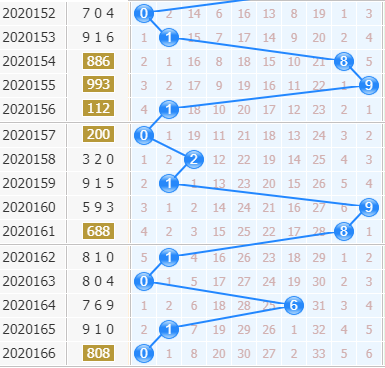 第20166期开出了808,十位上开出了0号球,号码是0路号码的开出,近期十位上0路号码开出都有连开的,本期也要看好0路号码的开出;9号球当前开出也是差不多五期左右的,接下来也要看好9号球的开出;6号球之前作为冷号开出了,当前也要看好6号球的升温;3号球有20期没有开出,近期也要看好冷号的开出。