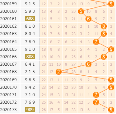百位上期开出号码9,号码还是在大号码的范围,近期出号也是完全偏向大号码的,本期也要看好大号码的表现;9号球近期开出还不错,有复开的机会,继续看9号球;6号球有些稳定的,开出也是差不多的间隔的,小防6号球;5号球现在是空缺了13期,上一次5号球开出也是间隔了13期,看好同间隔出号,具体推荐本期百位胆码:2569