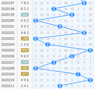 第20211期开出了241,十位上开出了4号球,号码还是1路号码的开出,近期1路号码开出之后还是0路号码的机会更大的,本期看好0路号码;0号球开出都是小间隔,出号也是比较温的,看好0号球的表现;3号球当前也是有升温的,本期继续看好3号球;6号球当前也要出号的,本期继续关注6号球。