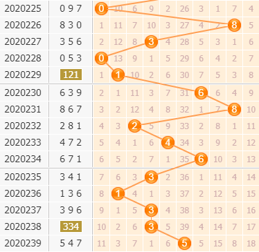 百位上期开出号码5,5号球之前走冷了39期的,大冷号的开出,这样一来,百位号码就是要偏向冷号的开出,7号球和9号球就是空缺了十五期以上的,接下里也要关注这两个号码;0号球也是有11期没有开出的,之前0号球有间隔11期开出过,小防同间隔出号,小孔明本期参考号码走势分析,重点推荐百位胆码:0179