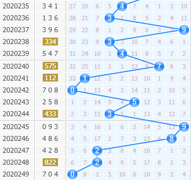 第20249期开出了704,十位上开出了0号球,号码笔直走小了,这一次小号码连着了三期,出号都在小号码停留,接下来号码肯定是会上升,但是走势幅度不会很大,主看小号码;2号球近期开出比较多,出号的可能性很大;0号球上期开出了,而且是回暖的出号,小防0号球的复开;3号球开出也有些稳定,号码间隔五期有比较多,之前好几次都是间隔五期出号的,本期继续关注3号球。