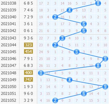 第21052期开出了329,十位上开出了2号球,号码保持了偶数号码的连开,而且十位上偶数连开也是很强势的,本期继续看好偶数的开出;0号球是在走小的趋势上,开出还算不错,有机会出号;4号球也是升温很快的号码,本期看好它的表现;6号球每一次开出都会有升温的机会,之前间隔八期出号,现在留意隔期回补。