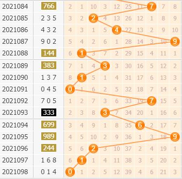 百位上期开出号码0,这个0号在走势上难得作为斜连号出现,和上两期奖号1和2形成阶梯状走势,连续回拉1点振幅,来到了最小数0号上,走势上势必会出现一定的反弹效果,而目前小区号码集中的情况下,建议集中杀大数号,金手指本期参考号码走势分析,具体推荐百位杀三码:589。
