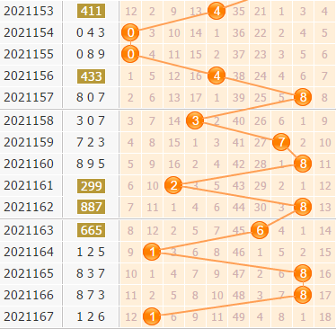 上期百位上开出了一个小号码,近期百位上号码都是在两端取值的,中间段的号码出号力度不足,一直都没有动静,本期也不建议关注;5号球作为一个大冷号,近期出号的机会不大;4号球也有些冷,不看好它的表现。2号球偏向小号码,但是小号码刚刚开出,本期很大可能走大,不看好2号球出号。