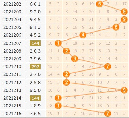 3d第21216期开奖号码是765,百位上开出了7号球,开出了大数、奇数、1路、质数号码