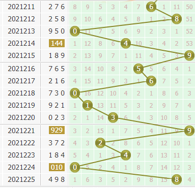3、根据上期(上期试机号和值-上期试机号个位)+(上期开奖号和值-上期开奖号个位)所得的尾数杀本期开奖号个位,(16-7)+(21-8)=9+13=22,本期个位杀掉2号球的开出。