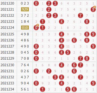 近30期里号码0-9出现开出频次分别为:号码0出现9次,号码1出现9次,号码2出现10次,号码3出现7次,号码4出现11次,号码5出现6次,号码6出现8次,号球7出现8次,号码8出现8次,号码9出现9次;一般来说,表现最冷的两码:3、5,不会同时出现,本期杀一码:5;表现最热的号码:2、4,一般会出现奖号,那么剩下的表现比较一般的可以选择几个排除,从走势来看,可以排除:1 9