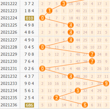福彩3d第2021236期开奖号码是686,百位上开出了一个6,开出了偶数、大数、2路号码。