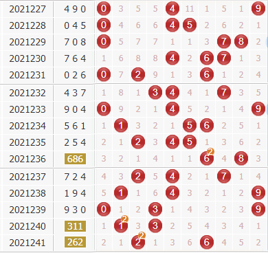 第2021241期3D奖号组选为:262,近30期里,号码0出现10次,1出现9次,2出现10次,3出现6次,4出现12次,5出现6次,6出现8次,7出现7次,8出现7次,9出现9次,奇偶比为39:51,偶数多于奇数,本期看好奇数走热,奇偶比参考2:1;大小比为:39:51,小号火爆,本期看小数热出,大小比参考1:2。