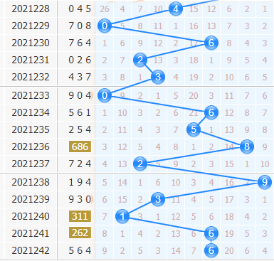 3d第2021242期开奖号码是564,十位上开出了6号球,开出了偶数、大数、0路号码。