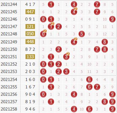 近30期里号码0-9出现开出频次分别为:号码0出现10次,号码1出现11次,号码2出现9次,号码3出现6次,号码4出现12次,号码5出现4次,号码6出现9次,号球7出现9次,号码8出现5次,号码9出现7次;一般来说,表现最冷的两码:5、8,不会同时出现,本期杀一码:5;表现最热的号码:0、1、4,一般会出现奖号,那么剩下的表现比较一般的可以选择几个排除,从走势来看,可以排除:2 3