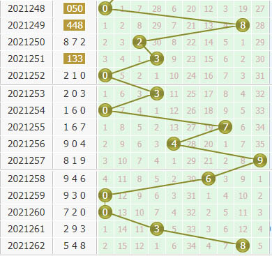 个位奖号8最近三期开出之后,其下期分别落号:6、4、2,近50期里6开出了5期,4开出了9期,2开出了3期,号码出现在:高频区域、高频区域、低频区域,本期个位可以排除低频号码。