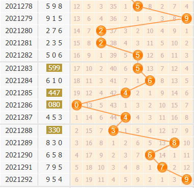 百位杀号:上期百位开出号码9,历史上近50期百位号码9已开出6次了,最近6次百位号码9出现之后,其下期各号分别是8-9-7-1-2-2。
