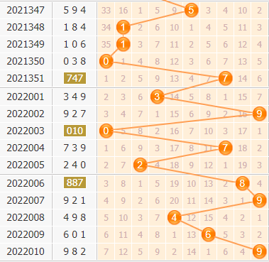前三次百位号码9出现之后,其下期奖号分别开出:2、0、4,近50期里2出现了5次,0出现了3次,4出现了5次。出现在:低频区域、低频区域、低频区域,本期百位排除高频区域号码。
