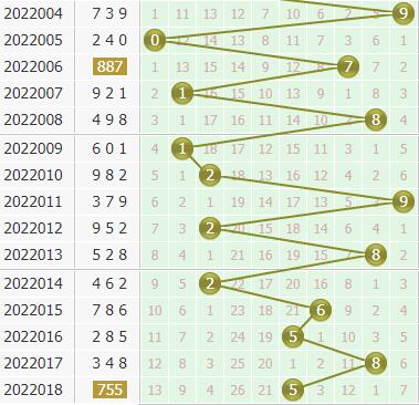 2、根据上期试机号个位+上期开奖号个位,乘以2所得的尾数杀本期开奖号个位,6+5=11,11*2=22,本期个位杀掉2号球的开出。