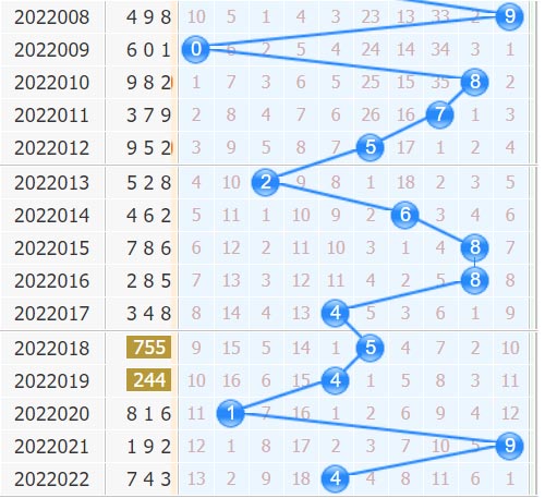 十位上近10期的走势为2-6-8-8-4-5-4-1-9-4,共开出了7次偶数,3次奇数,偶数的开出占优势,并且上期也是偶数的开出,因此更看好十位偶数的开出——02468;而近10期的十位开出大数5期,小数5期,大小开出是持平状态的,而近5期是小数的优势,因此可以看好小数的开出——01234,结合奇偶、大小的分析,重点推荐本期十位胆码:024