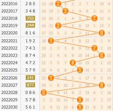 前三次百位号码5出现之后,其下期奖号分别开出:4、1、5,近50期里4出现了6次,1出现了3次,5出现了5次。出现在:高频区域、低频区域、高频区域,本期百位排除低频区域号码。