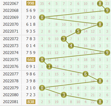 个位奖号8最近三期开出之后,其下期分别落号:9、5、0,近50期里9开出了5期,5开出了5期,0开出了4期。号码出现在:低频区域、低频区域、低频区域,本期个位可以排除高频号码。