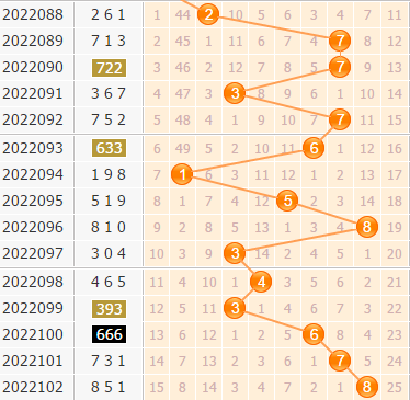 9号球是目前最冷的一个号码,有25期没有开出,不看好它的回暖;8号球上期刚刚开出,百位上复码开出更少,不看好8号球再开。
