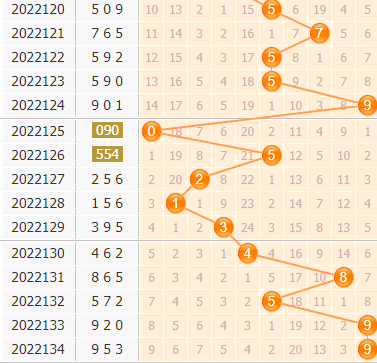1、根据近5期百位相加所得的尾数杀本期开奖号百位,即4+8+5+9+9=35,本期杀掉5号球的开出。