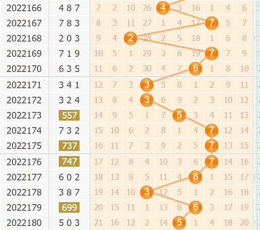 百位上近10期的走势为3-3-5-7-7-7-6-3-6-5,共开出了2次偶数,8次奇数,偶数的开出占优势,偶数的势力很强势,因此更看好百位偶数的开出——02468;而近10期的百位开出大数7期,小数3期,大数的开出强势期,而近5期也是大数的优势,因此可以看好大数的开出——68,结合奇偶、大小的分析,重点推荐本期百位胆码:68