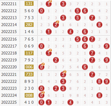 3d第22225期开出号码为410,开出了小小小、偶奇偶组合,和值是5,和尾是5,组六形态。
