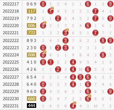 昨天的3d开奖结果开出了444,开出了小小小、偶偶偶,和值12,和尾是2,跨度是0,以下3d之家福彩3d杀号专家结合各项数据和精湛的杀号技巧,分别对百位、十位、个位、组选杀号分析供彩民参考。