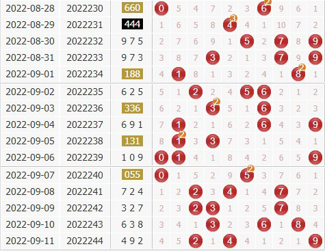 3d第22244期开出号码为492,开出了小大小、偶奇偶组合,和值是15,和尾是5,组六形态。