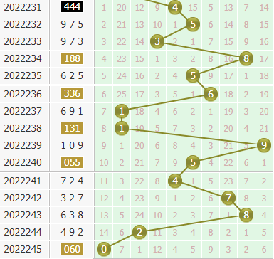 2、根据上期试机号百位+上期试机号个位,乘以4所得的尾数杀本期开奖号个位,1+6=7,7*4=28,本期个位杀掉8号球的开出。