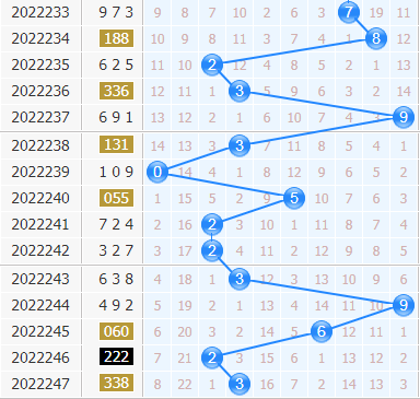 福彩3d第2022247期开奖号码是338,十位上开出3号球,开出了小数、奇数、0路号码。