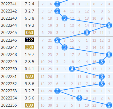 福彩3d第2022255期开奖号码是099,十位上开出了9号球,开出了奇数、大数、0路号码。