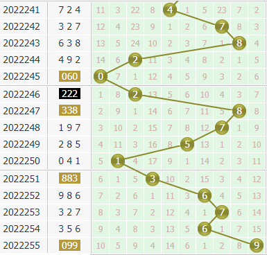 3、根据上期(上期试机号和值-上期试机号个位)+(上期开奖号和值-上期开奖号个位)所得的尾数杀本期开奖号个位,(16-3)+(18-9)=13+9=22,本期个位杀掉2号球的开出。