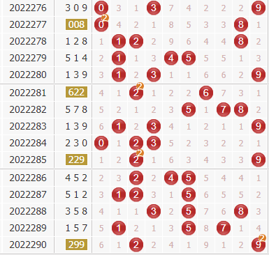 3d第22290期开出号码为299,开出了小大大、偶奇奇组合,和值是20,和尾是0,组三形态。