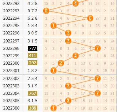 3d第22306期开奖号码是188,百位上开出了1号球,开出了小数、奇数、1路、质数号码。