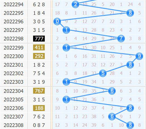 福彩3d第2022308期开奖号码是087,十位上开出了8号球,开出了偶数、大数、2路号码。
