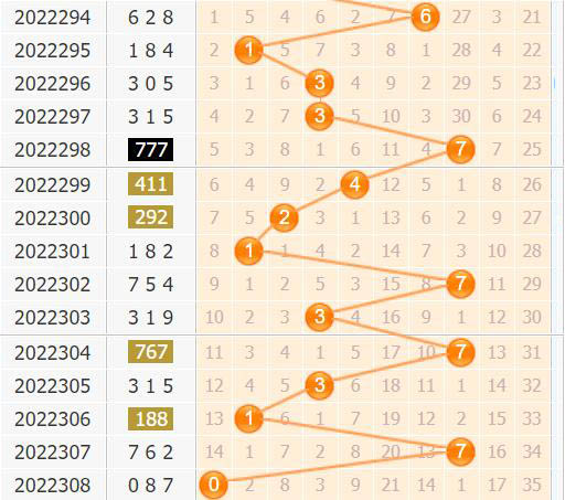 百位上近10期的走势为4-2-1-7-3-7-3-1-7-0,共开出了3次偶数,7次奇数,奇数的开出占优势,并且近5期的奇数也是优势开出,因此更看好百位奇数的开出——13579;而近10期的百位开出大数3期,小数7期,大数的势力不强,近5期是小数的优势,因此可以看好小数的开出——01234,结合奇偶、大小的分析,重点推荐本期百位胆码:13