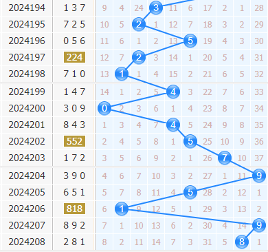 福彩3d第2024209期开奖号码是281,十位上开出了8号球,开出了偶数、大数、2路号码。
