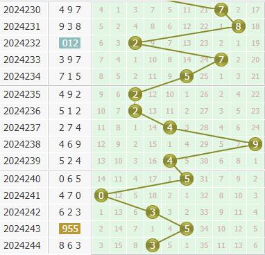 上期号码是走小开出,个位上小号码开出强势一点,不过上一次刚刚有连开过,这一次连开机会不大,更看好大号码的表现;上期号码也是走热开出,走热了两期,本期要严防冷号的回暖。
