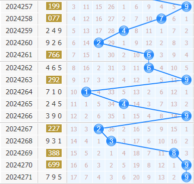福彩3d第2024271期开奖号码是795,十位上开出了9号球,开出了奇数、大数、0路号码。