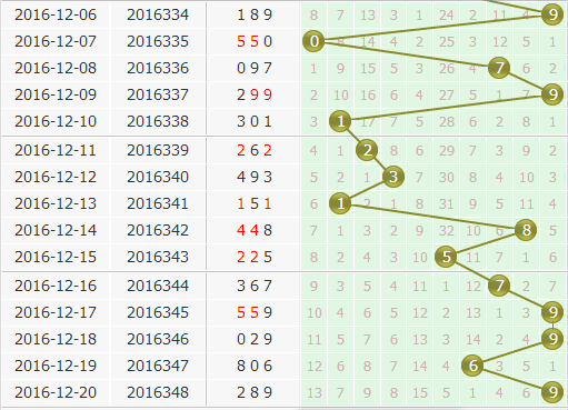 上期的开奖号码是289,个位上开出了9,根据杀号公式和值尾+4,杀个位得到3。根据杀号公式上期跨度,杀个位得到7,看个位走势图,7在近十五期的平均遗漏期数为6期,当前遗漏为4期,本期觉得7应该还没到时候开出。最后根据一个杀号公式上期十位杀本期个位得到8,8虽然在近期刚开出过,根据它在近二十期的平均遗漏期数为9期,当前遗漏才为6期,所以本期不看好8的开出。