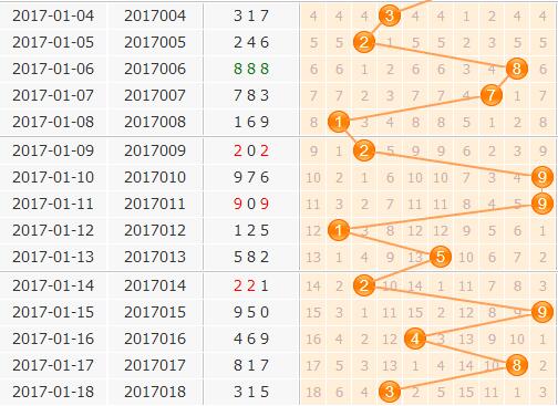 上期的开奖号码是315,百位上开出了3号球,结合近期的百位走势图分析,0号球无疑是近期最大的一个冷号,自从那一次两期连开之后已经遗漏了18期了,本期不看好0号球爆冷开出;4号作为3号球的邻码,但是百位上近15期都没有出现过邻码,本期建议4号可杀;8号是隔期号码,但是纵观近30期百位走势来看,8号球的开出间隔是一次比一次大,本次隔期开出的几率不大,建议杀掉。