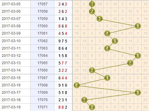 上期的开奖号码是882,开出了一个偶数号码,分析个位的奇偶走势来看,个位上一期是开出了一期偶数号码,最近偶数都是连着的开出,奇数开出的力度异常的小,本期不看好奇数号码。5号球最近的走势偏冷,当前也有连续9期没有开出,本期不看好5号球;2号球是上一期的开奖号码,个位上近期重复号都没有开出,本期不建议关注2号球;3号球是位于斜连号的位置,个位上邻码开出的比较热门,但是斜连号的开出并不常见,本期也不看好3号球。