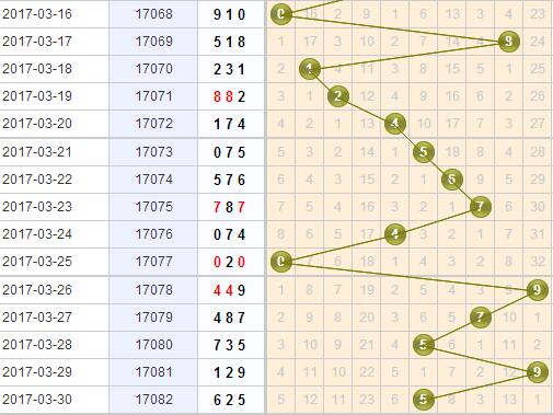 上期的开奖号码是625,分析近期个位上的大小走势来看,最近大数是完全占领了个位,一连五期都是大数号码的开出,但是五期已经是最大的连开期数了,本期不看好大数的继续开出。5号球是上一期的开奖号码,个位上重复号的走势非常冷,本期不关注重复号;8号球已经是连续13期没有开出了,是大数里面最冷的号码,本期也不看好;再结合一个杀码公式,上一期的十位杀本期个位,上一期十位开出2,本期杀掉2号球。
