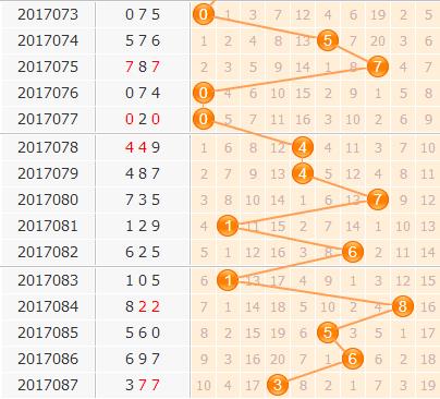 上期的开奖号码是377,百位上开出了3号球,结合近期的百位走势图分析,5号距离上一次开出才过了2期,而5期近期可以很明显看到走势越来越冷,从一开始的间隔3期出现到上次的间隔了10期,本期不看好5号球开出;6号是隔期号,近期隔期号出现频率低,且6号球一向热度的保持性就很差,很容易再次走冷,本期看淡6号;8号一直以来就是一个冷号的形象,目前想要开出还不符合近期的规律,本期杀掉8号。