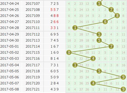 上期的开奖号码是439,个位是开出了9号球,振幅开出了5号球,最近个位上开出的振幅开始偏大,不过振幅还是集中在5左右,所以本期不建议关注小振幅开出。3号球已经有连续26期没有开出,本期不看好3号球;1号球之前连着两次开出都是间隔了5期,当前遗漏是4,本期不看好1号球;再结合一个杀码公式,上期的百位杀本期个位,上期百位开出4号球,所以杀掉4号球。