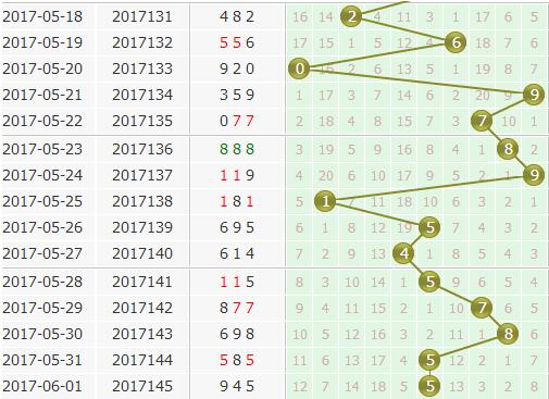 个位上是开出了重复号5号球,重复号在个位上的走势到没有非常热,这一次开出也是间隔了十四期,但是个位上最近邻码开出的非常频繁,本期也看好邻码,不关注孤码的开出。7号球虽然走势偏暖,但是还是大间隔开出的,不关注7号球;2号球和0号球这两个冷号,最近冷号开出的力度减弱了很多,不建议关注。