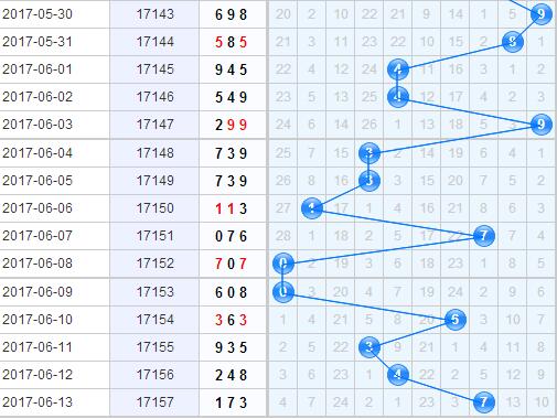 上期是开出了173,十位上开的是7号球,很显然这是一个大号码,但那是最近十位上大号码开出的比较弱势,一期开出也足矣,本期还是更看好小号码开出。1号球最近有明显的走暖趋势,可以关注1号球的开出;2号球是当前最冷的号码,可以严防一下冷号的突袭;4号球当前遗漏是1,开出的可能比较大,可以关注。