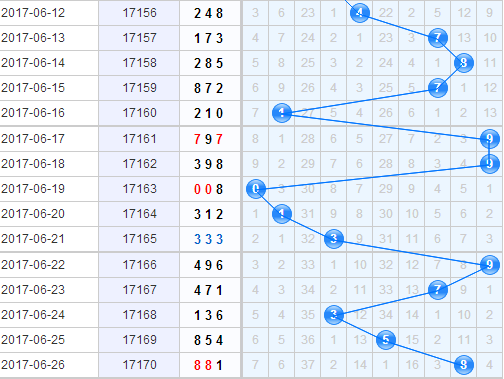 上期是开出了881,十位上是开出了一个大数,截止到上期,从左往右的走势上,已经有三个号码在了,接下来肯定是要转身往左方向开始移动,本期也继续关注左边的号码开出。4号球和6号球是唯二两个遗漏间隔在十期左右的号码,最近遗漏在十左右的号码开出的很多,本期关注这两个号码开出;3号球最近开出的走势比较好,看好3号球。