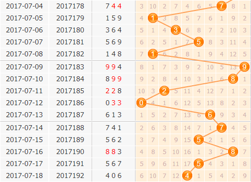 上期的开奖号码是406,百位上开出了奇数5号,而百位走势上看,奇数和偶数在近期都有持续性的爆发,而奇数的爆发力更强一些,但是偶数连开表现的次数多,因此两者是处于持平状态的,上期偶数拉回开出,本期看好奇数。其中7号球在近期的往来中部符合它本身出号的规律,而且出号也不热,本期7号可排除。