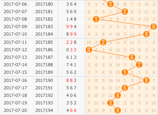 上期的开奖号码是466,百位上开出4号球,从近期百位的大小走势来看,虽然大数有意在拉动,但是整体还是朝着小数的方向前进着,4号球上期又隔期开出了,有走热的可能,要严防4号重复开出;如果4号回头一个摆动之间,按照振幅看出号几率最高的是1号和0号;在大数上可防已经遗漏了7期的6号球。